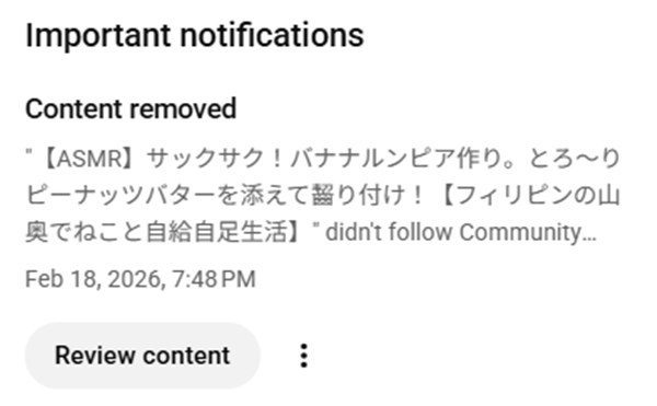 こんなの初めてです。今まで警告はあってもいきなり削除されるなんて事はありませんでしたが、規制が厳しくなり、アップした瞬間に削除されるようになりました。子どもに対するポリシーが厳しくなり、子どもがものを食べているシーンなどが駄目っぽいのです。
